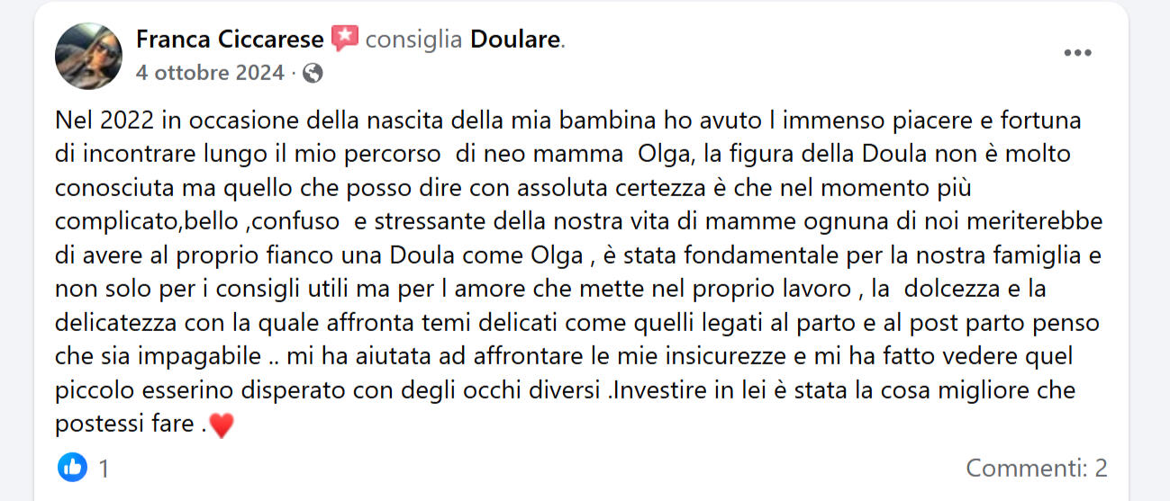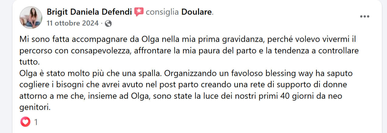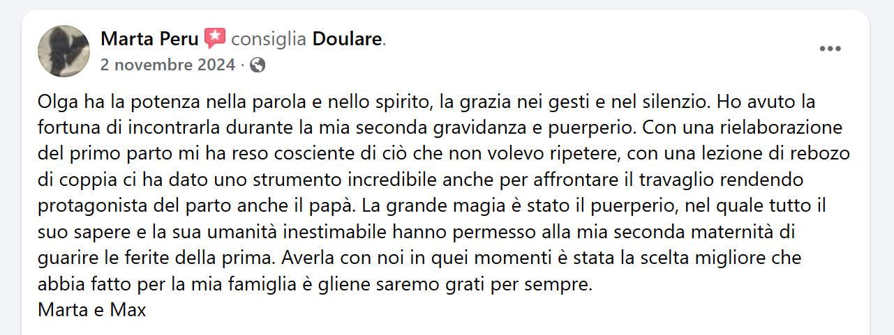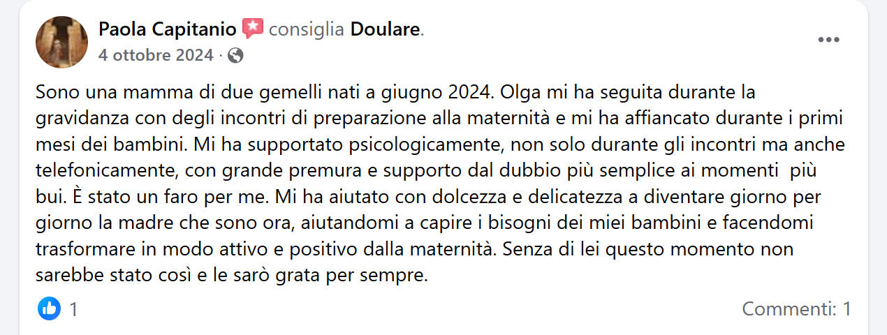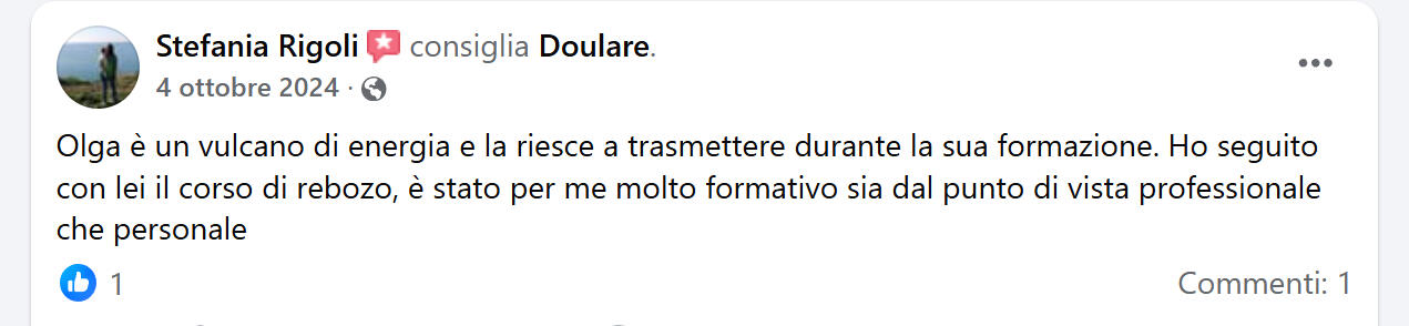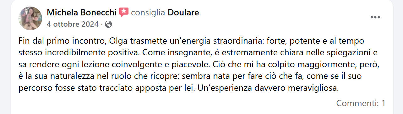 La cura, l'attenzione e l'anima che Olga mette nel tramandare questa tecnica di cura e sostegno della donna è stata fortissima! L'imprinting avuto con lei è stato decisivo nella scelta di continuare la mia formazione con Olga come Doula."